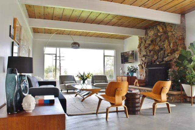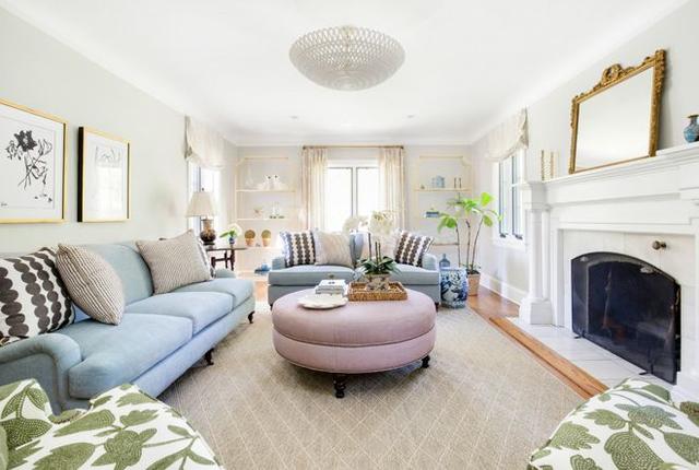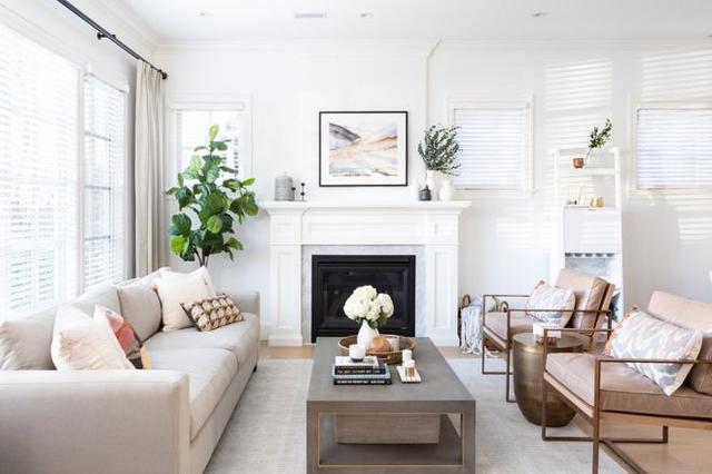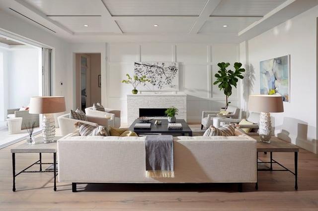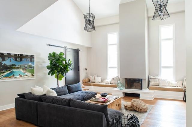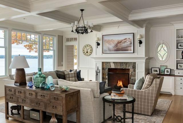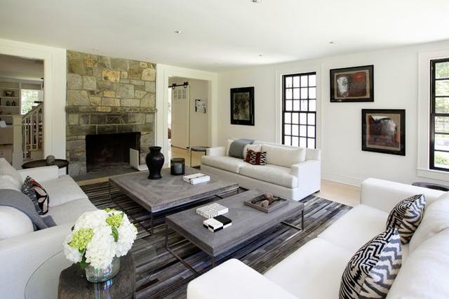 当空间和预算允许时,可以在超大桌周围安排几张沙发,就像在这个过渡空间中所做的那样。请注意,方桌位于彼此相对的两张沙发之间,而窄桌则用于石壁炉对面的沙发。
