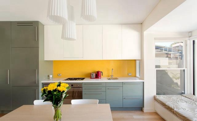 在当今流行的多功能房间中,餐厅和厨房的界线往往模糊不清,甚至根本不存在。在这种情况下,如果餐厅的颜色保持中性,你可以考虑使用邻近的色系来装饰空间,比如绿色的橱柜和黄色的墙面。
