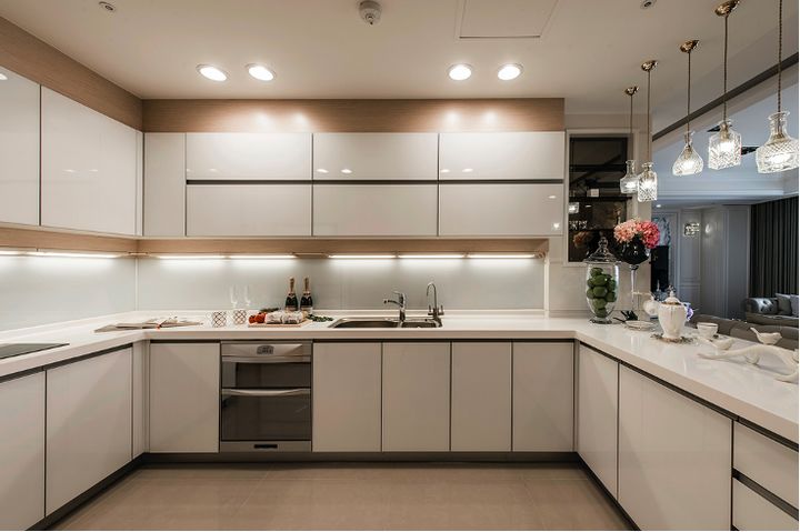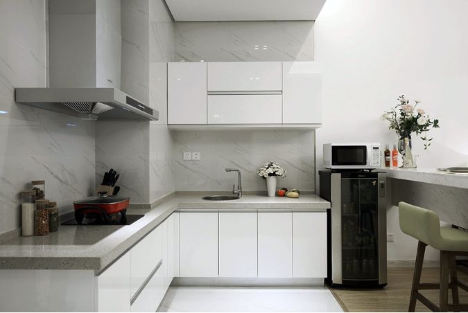 首先来说下厨房的整体设计。随着时代发展与生活方式的改变,厨房早已打破了只能用来做饭的“身份”限制,被赋予了更多可能性,比如,在厨房我们可以团聚、社交、工作……因此,厨房整体的美观性就显得非常重要。一般情况下,厨房空间的整体配色最好控制在3种以内,这样看起来比较干净和高级。如果厨房面积比较小,橱柜就是空间配色的主题,最好选择浅色调的橱柜来减少空间的压抑感,让厨房在视觉上更宽敞。如果厨房面积较大或者不知道选什么色调,可以选择黑白灰、米色、浅咖、木色等颜色,沉稳大气,简单干净,而且不会出错。