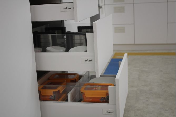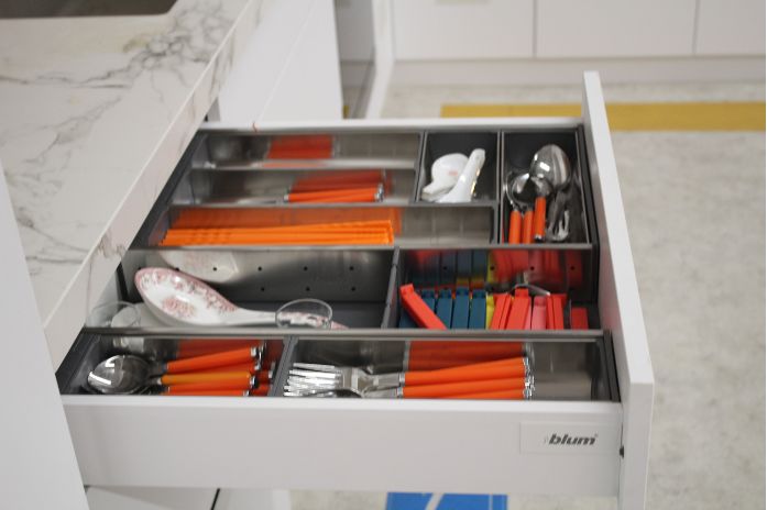 其次,作为日常使用的地方,除了美观性,厨房的实用性也非常重要。最基本的是操作台面全且台面空间足够,在条件允许的情况下尽量多做抽屉。厨房里各种厨具多而杂乱,抽屉可以帮助你有效做好收纳,同时也能提高下厨效率,缩短下厨时间,让做饭变得更加简单、轻松。我家用的就是百隆豪华金属抽,不得不说颜值很高,而且很实用。相较于市面上常见的、安装在抽帮两侧的钢珠式导轨,百隆豪华金属抽采用的是骑马抽导轨,导轨和抽帮相连,可以很好地隐藏导轨,,让抽屉更美观;而且,百隆豪华金属抽系列导轨还有很强的承重能力,像我比较喜欢做饭,家里的锅具、瓶装调料大大小小买了很多,也比较重,收纳在抽屉里,本以为抽拉过程会非常不顺滑,没想到开合体验和空无一物时一样好——在拉开抽屉的那一瞬间,舒适体验随着更低的开启力度和“轻如鸿毛”般轻盈滑动扑面而来,让开合过程更趋完美!当然,作为收纳厨具的场所,抽屉还要具有很强的收纳性能。百隆豪华金属抽有多种高度可供选择,满足不同的收纳需求。搭配内分隔件,可以把物品分门别类、按照用途进行收纳,让抽屉空间整洁有序。