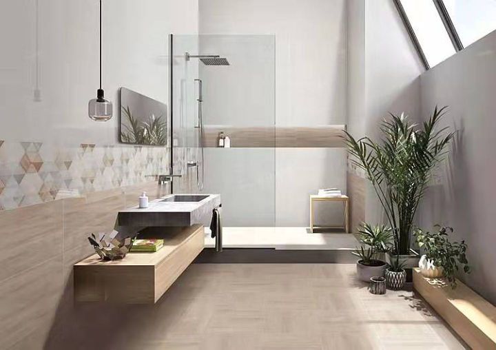 上图中的卫生间案例就用了“干湿分离”布局法,设在里面的淋浴区充分利用了角落的天然优势,只安装一扇玻璃门就形成了三角形的独立淋浴房,与其余区域隔离开来。淋浴房外不仅设置了洗漱区,还设置了绿植区,四五盆绿色的盆栽摆在墙边,吸收着外面照射进来的阳光,长势欣欣向荣,既清新了室内空气,又美化了卫生间环境。装修设计方面,干区地面以原木色瓷砖为主,而湿区铺的是白色瓷砖,通过瓷砖颜色将两大功能区域划分开来。墙面则大面积铺贴了白色瓷砖,与原木色瓷砖相互搭配,并用彩色格子瓷砖做点缀,给清爽的空间增添了几分活泼感。卫浴间布局的方法还有很多,但不管选用哪种方法,都要充分考虑空间的实用性和美观性,只有二者兼顾才能称得上完美的卫浴家装。