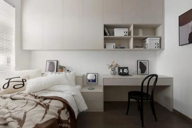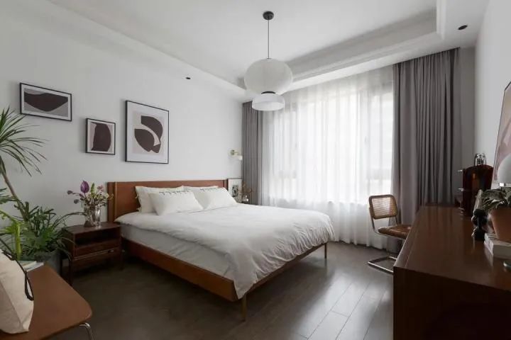主卧进行了功能区的分离后不会显得空旷,空间的使用效率也得到了提升。硬装较为简洁,更多的设计是在舒适的软装上,中古的家具有种沉稳优雅的氛围,简单的环境可以让人更好的入睡。