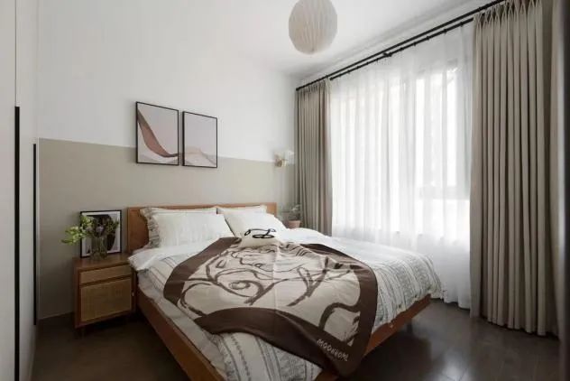 次卧的装修比较简洁,中间分色的墙面让空间有了层次感。整体为暖色调,房间显得温馨又舒适,相似的色调让空间显得更加和谐统一。